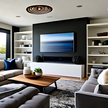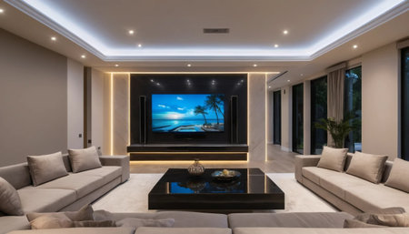High-End Tech-Infused Media Room A luxurious media room featuring a wall-mounted TV, state-of-the-art sound system, mood lighting, and plush seating.