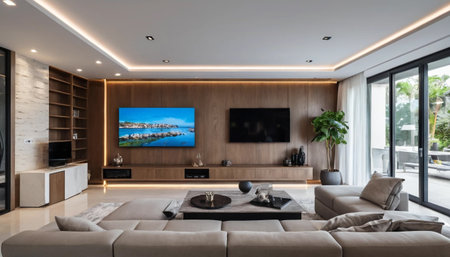 Explore a modern living room featuring minimalist design with a large TV, sleek furniture, and abundant natural light, perfect for relaxation and style.