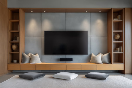 A sleek contemporary living room with a large TV set into a concrete panel wall, flanked by built-in wooden shelving. Cozy pillows on a bench create a comfortable space.
