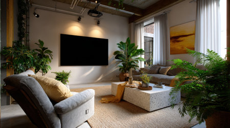 Explore a stylish living room featuring a large home theater screen, lush indoor plants, and modern furnishings that create a warm and inviting environment.