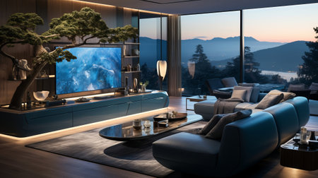 High-tech living room in crystal blue, with smart entertainment systems that integrate seamlessly into the space. The room features augmented
