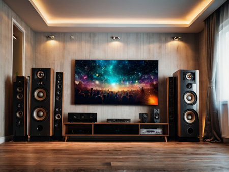 A home theater system with surround sound speakers installed in a living room, enhancing entertainment