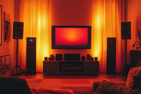 Warm orange lighting enhances a relaxing entertainment space with a modern television and speakers.