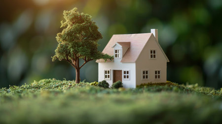 Miniature model house and tree on green moss background. Real estate concept