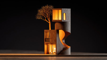 Meticulously crafted, miniature model of a modern residential structure. The design features a unique, curved staircase and multiple levels, all rendered in a warm, inviting light. The model is set on a dark background, highlighting the intricate details of the home's architecture.