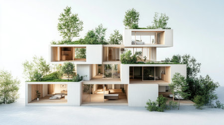 A stunning modern villa featuring a unique stacked cube design, adorned with greenery and a lush green roof, creating a harmonious blend with nature.