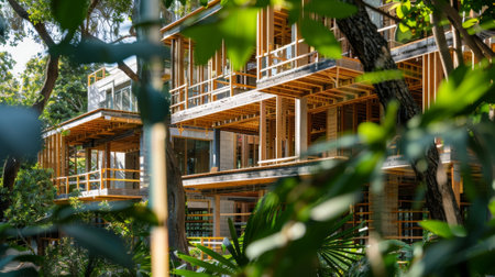A construction site surrounded by trees and greenery showing the integration of natural elements and materials in sustainable building