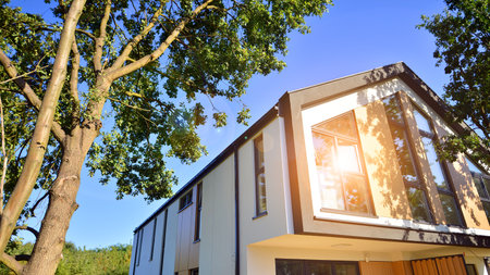 New build single family house. Suburban area with modern geometric family house.