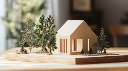A cutaway house model in plywood on a table with blueprints, showcasing modern two-story design. Professionally lit for a clean look.
