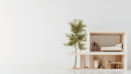 A minimalist living space displayed in a clean, open environment features a bedroom, seating area, and an indoor tree. The design emphasizes simplicity and natural elements.