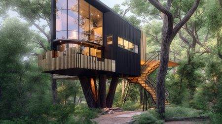 The exterior design of modern and luxurious treehouse in the forest. Generative AI image AIG30.