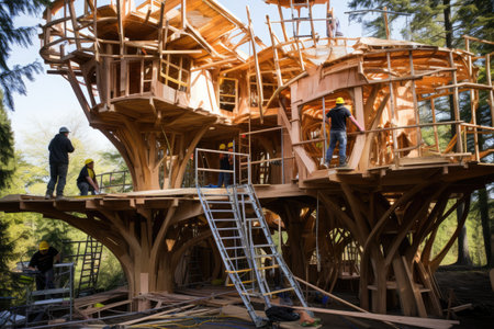 Construction of a tree house, Illustration of futuristic tree house surrounded by greenery, Whimsical wooden treehouse - an adventurous designer treehouse with architecture imagine, Ai generated