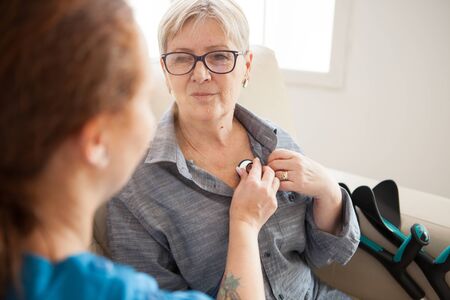 Back view of nurse listening old woman heart beat in a nursing home with stethoscope.