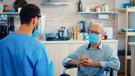 Disabled senior man in wheelchair discussing with caregiver about coronavirus during home visit. Social worker offering pills to handicapped elderly man. Geriatrician helping prevent covid-19 spread