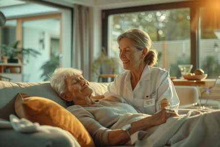 Caring interaction between a nurse and an elderly woman in a cozy living room