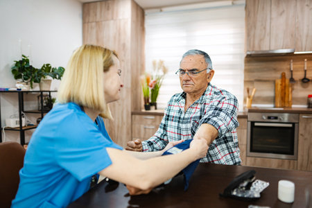 Caregiver doing regular check-up of senior woman in her home.