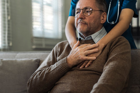 Emergency medic attending to unwell male patient on couch in living room setting, providing crucial aid and comfort, capturing moment of attentive medical care