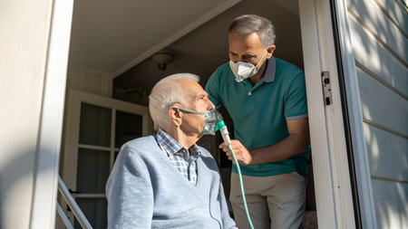 Senior man with oxygen mask using oxygen mask while standing in front of home
