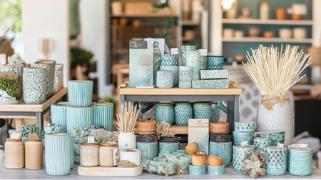 A beautiful showcase of elegant ceramic containers and scented candles, perfect for home decor enthusiasts. This inviting retail display features a soothing color palette and stylish organization, creating a tranquil atmosphere ideal for inspiration.