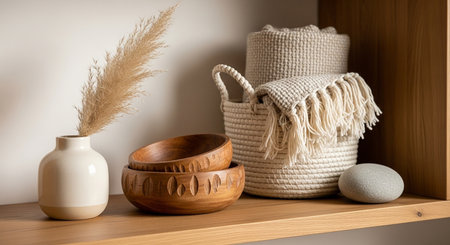 A beautifully arranged shelf featuring candles, wooden elements, and textiles that create a stylish and inviting home decor scene. The neutral tones and greenery add warmth.