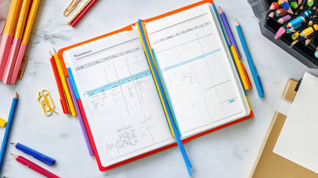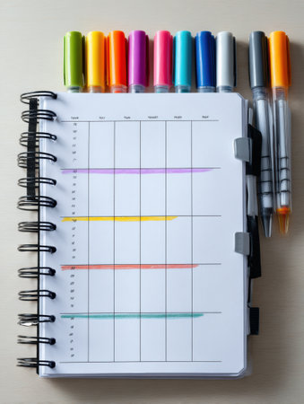 Notebook is being prepared for planning with various colored markers arranged neatly, showcasing a clean top margin ready for notes or tasks.