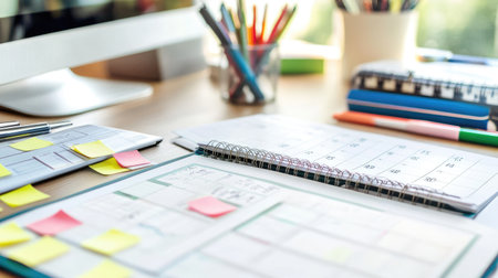 A bright office desk scene featuring colorful stationery, notebooks, calendars, and sticky notes arranged for effective planning and productivity in a modern workspace.