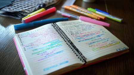 A picturesque scene featuring an open notebook with handwritten notes resting on a wooden table, illuminated by soft natural light, inspiring creativity and organization.