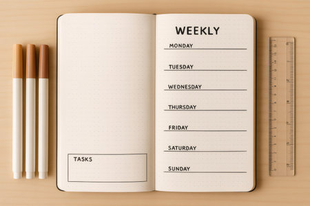 Colorful markers sit beside an open notebook, showcasing a clean page lined for planning weekly tasks and enhancing organization for productive days.