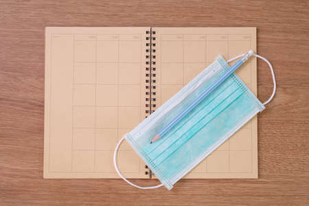Top view of old notebooks, anti-virus mask and pencil on wooden background.