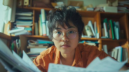 An eclectic collection of scattered papers and notes fills a wooden table, with various stationery items peeking out amidst the organized chaos. Late afternoon sunlight softly illuminates the workspace, highlighting the creative process at play in this dynamic and thought-provoking environment.