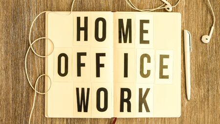 lightbox with text HOME OFFICE WORK with notebook pen and headphones, copy space wooden table background, quarantine and isolation HOME OFFICE, coronavirus, europe