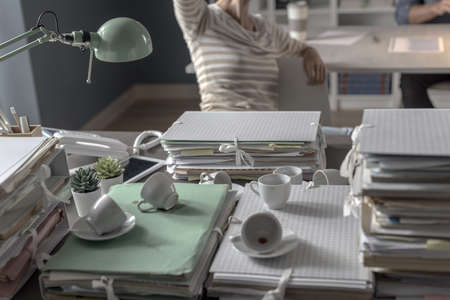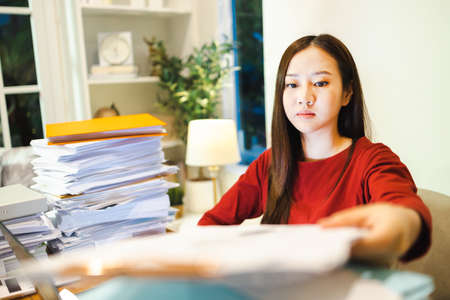 Female freelancer working overtime at home office and doing paperwork and accounting