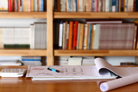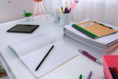 tidy workspace background to study or work at home - open blank notebook with pens, books and a cup of coffee on a wooden table of a freelance office