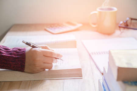 Woman right hand writing on notebook at home area in morning with sun light and vintage tone.