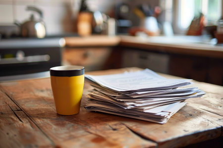 A neat stack of papers placed on top of a wooden table, A stack of paperwork next to a cup of coffee on a kitchen table