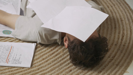 Top view of a young male college student lying on the floor of a room, giving homework or studying for an exam. He gets tired and falls asleep on the floor.