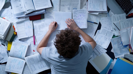 A man is sitting on the floor surrounded by papers and books. He is writing on a piece of paper with a pen. Concept of chaos and disorganization