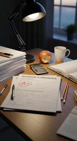 A desk filled with open textbooks, notebooks, pens, and pencils, creating a studious environment ideal for tutoring or learning.