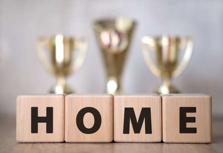 HOME website - marketing concept on wooden cubes with a background of cups and prizes