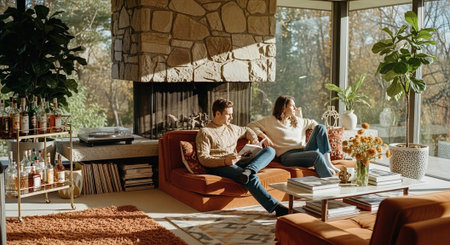 A cozy living room with a modern design, featuring a large yellow sofa, a coffee table adorned with flowers, and two people enjoying drinks