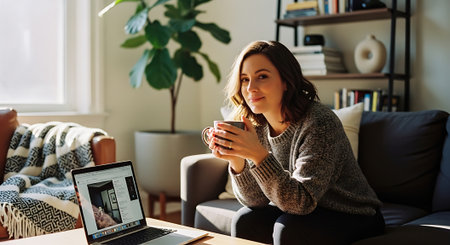 A serene living room with a white couch, wooden coffee table, and natural textures, featuring a plant, book, and coffee cup, with warm sunlight streaming through the window.