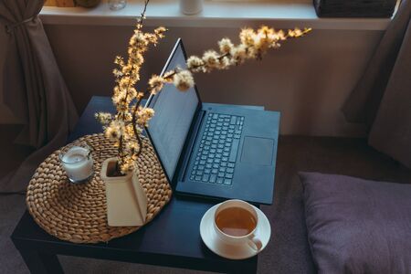 Home work place with laptop, cup of hot drink and blooming brunch in vase on coffee table near window on sunset or sunrise. Freelance, working from home, online learning, studying, home office concept.