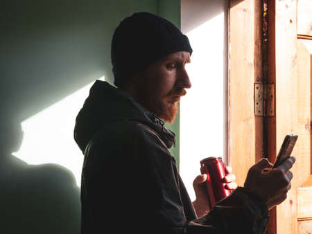 Bearded millennial man in black raincoat with smartphone in hand texting against wall with harsh shadow. Authentic male traveler Blogger guy lifestyle Solo travel adventure. Blogging communication