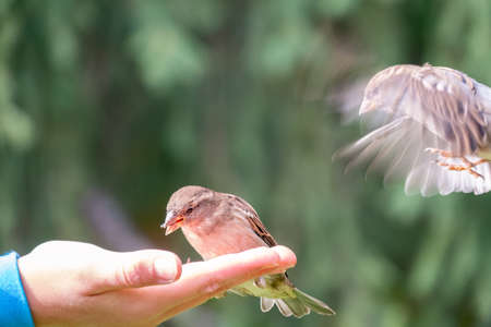 Little nimble sparrows feed from the hands in summer Sunny day.