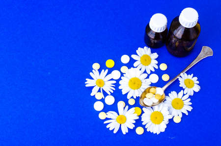 Homeopathic globules and glass bottle on blue background. Alternative Homeopathy medicine herbs, healtcare and pills.