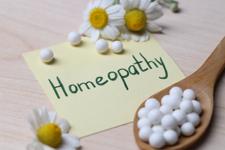 Sticky note with the word Homeopathy, pills and chamomile flowers on wooden table, closeup