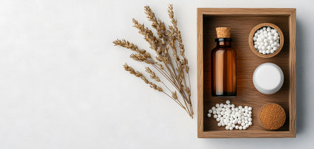 A neat arrangement features a brown bottle, white globules, and dried herbs in an elegant wooden tray. The background is solid and light, evoking serenity.
