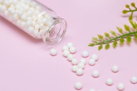 Homeopathic globules scattered from a clear glass bottle on light pink background with herbs close up, alternative homeopathy medicine and naturopathy concept.