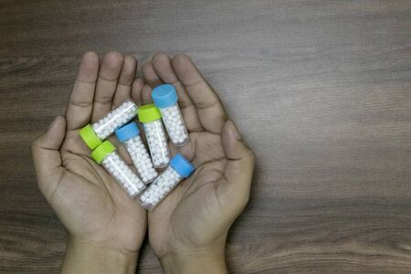 Top view image of a man hands holding bottle of homeopathic pills on wooden background