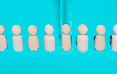 Baby birth concept with test tubes. Artificial insemination. Wooden figures under test tube on a blue background